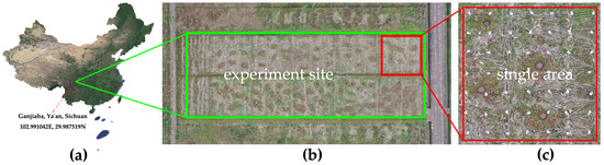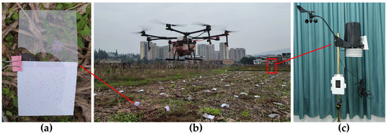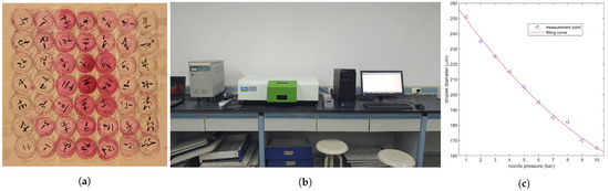 According to Sheng et al.’s method [49], 0.1 g/L Rhodamine-B solution (analytically pure) was used to spray rather than pesticide. As shown in Figure 3b, polyethylene terephthalate (PET) sheets (85.60 mm × 53.98 mm) were placed at 154 (11 × 14) sample points 0.3 m above the ground, and the spacing between them was 0.5 m. The UAV is equipped with four nozzles (XR11001VS, Tejet Spray Technology Co. Ltd., Tianjin, China), which are located on two sides of the UAV (X = ±265, Z = ±711 mm). The relationship between nozzle pressure and droplet diameter curve in accordance with the user manual is shown in Figure 6c. Figure 6b shows the fluorescence spectrophotometer (LS55, PerkinElmer Inc., Waltham, MA, USA) used for measuring the solution concentration. The experiment process is as follows.