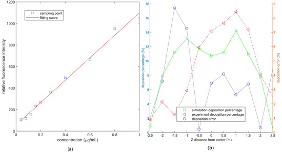 Figure 7. (a) shows the standard curve of the relationship between relative fluorescence intensity and solution concentration. (b) shows the droplet deposition ratio in the experiment and simulation, and the error between them. - Under the propeller speed of 3500 rpm, four nozzles continuously worked for 5 s to spray 0.1 g/L Rhodamine-B solution. The white PET sheet was washed with secondary distilled water within 20 min until no obvious red dye residue was found after the droplet deposition. Part of the collected solutions after washing is shown in Figure 6a.
