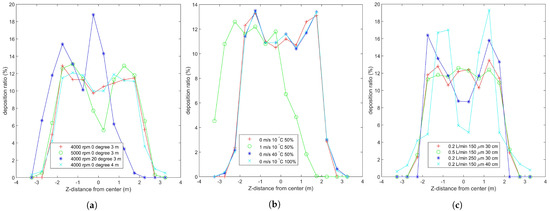 The four curves in Figure 8a correspond to the four figures in Figure 9, which reflect the effect of droplet movement and deposition characteristic under different flight states. From the comparison between Figure 9a,b, the faster the propeller speed is, the stronger the downwash wind field, and many droplets are drawn into the propeller by the airflow. The large negative Y−direction velocity leads to the decrease in the spray divergence [24], and its center is the Y−direction projection of the nozzle. Figure 9c shows the droplet trajectory of the tilted UAV. The tilted wind field drives the droplets to move in the negative Z−direction, making the deposition ratio nonuniform. As shown in Figure 9d, the deposition distribution at the margin slightly increases with the increase in height. This condition may be due to the trajectory change caused by the breakup of droplets [19].