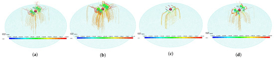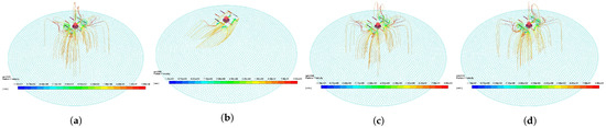 Droplet deposition trajectory under different nozzle states. The track color indicates the droplet velocity in Y−direction. (a) shows the nozzle working at a flow rate of 0.2 L/min, droplet diameter of 150 m, and a distance of 30 cm from the propeller. (b) shows the nozzle working at a flow rate of 0.5 L/min, droplet diameter of 150 m, and a distance of 30 cm from the propeller. (c) shows the nozzle working at a flow rate of 0.2 L/min, droplet diameter of 250 m, and a distance of 30 cm from the propeller. (d) shows the nozzle working at a flow rate of 0.2 L/min, droplet diameter of 150 m, and a distance of 40 cm from the propeller.