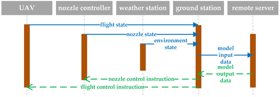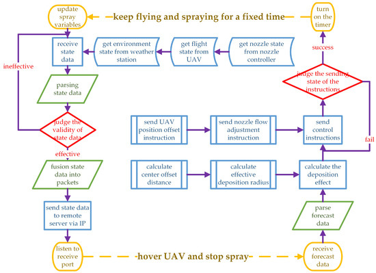 This study attempts to establish the relationship among UAV flight state (propeller speed, pitch angle, flight height), environment state (wind velocity, environment temperature, environment humidity), spray state (nozzle flow, droplet diameter, distance between propeller and nozzle), and spray droplet deposition distribution characteristics (effective deposition radius, center offset distance). A variable spray system with adjustable nozzle flow and controllable UAV offset is designed. In this study, the CFD simulation provides the data source, and the field experiment verifies the correctness of the data. Multiple regression methods are used to establish the relationship between sensor states and distribution characteristics. The effectiveness of a multi-sensor fusion variable spray system is verified through real farmland spray.