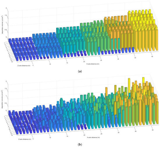 The four curves in Figure 8c correspond to the four figures in Figure 11, which reflect the effect of droplet movement and deposition characteristic under different nozzle states. As shown in Figure 11b, the nozzle flow is mainly reflected in the deposition volume rather than the ratio. However, the small droplet diameter is easy to be affected by wind, and the large droplet leads to nonuniform deposition, as shown in Figure 11c. Therefore, finding a suitable droplet diameter is necessary [18]. The distance between the propeller and the nozzle is related to the distribution of downwash wind field. A distance corresponding to the downwash wind field promotes the formation of a uniform deposition distribution [27].