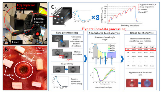 Temperature induces alteration into the tissue constituents and their structural organization, thus resulting in a measurable change of tissue optical properties. Shifts in absorption peaks, change in the index of refraction, biochemical change in hemoglobin, and variation in water content are among the effects occurring with a temperature increase, and the consequent thermal damage. Tissue chromophores such as oxyhemoglobin (HbO2), deoxyhemoglobin (Hb), and water (H2O) [19] are sensitive to the temperature of the environment, thus monitoring their spectral variation has the potential to be the basis for design a therapeutic supportive-tool, which can indicate the thermal tissue state [20,21]. In this scenario, hyperspectral imaging (HSI) holds the potentiality of combining spectral and spatial information of the thermal state of the tissue [22,23,24,25]. The use of HSI is rapidly increasing in the biomedical field, where HSI is devoted to “see the invisible” in several diagnostic and therapeutic applications [26,27]. Some of the numerous examples of the HSI potential for diagnostical purposes are the detection of cancers [28,29] by the differentiation of diverse protein biomarkers and genomic alterations [30], the digital and computational pathology [31], the non-invasive detection of skin chromophores and features [32]. Besides, HSI is also valid support for therapy and surgery guidance. It allows us to identify the anatomy and molecular content of tissue during a laparoscopic surgery of a swine [33], to visualize the chemical composition of tissue during renal surgical procedures in vivo [34], and to detect ischemia and anatomy of organs in animal models [35,36,37,38].