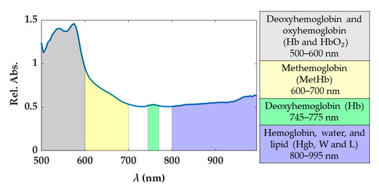 Under normal conditions, oxyhemoglobin (HbO2) and deoxyhemoglobin (Hb) are the principal chromophores of blood showing sharp absorption peaks [19]. The main blood spectral absorbance range falls within the 500 and 600 nm, though there is a visible Hb peak at approximately 760 nm. In this range, HbO2 presents a pair of peaks at 525 and 575 nm, while Hb at 540 nm approximately. The presence of blood in the part of the tissue analyzed would be distinguishable when two peaks appear in the spectral curve, as the sum of the absorption curves of both Hb and HbO2. The third type of hemoglobin, methemoglobin (MetHb), is produced by photo-induced oxidation of hemoglobin. The formation of MetHb is thermodynamically favorable and irreversible, but there is a barrier to the reaction requiring some minimum activation energy (heat) for initiation [42]. MetHb is formed at temperatures above 65 °C, and its presence in the spectral curves can be most noticeable in the spectral range of 600 to 700 nm (peak at approximately 630 nm). Also, in the range 800–995 nm the hemoglobin contribution cannot be excluded, and here broad peaks for the MetHb and HbO2 are present [19]. Conversely, the water absorption spectrum is higher over the near-infrared region, being nearly transparent in the visible range. Therefore, the presence of water in the tissue analyzed would appear in the spectral range from approximately 700 to 995 nm. Also, for the fatty tissues, the lipids show a dominant absorption peak at 930 nm [43]. Previous studies have shown absorption spectra variation in shape and magnitude for water, Hb, and HbO2 when a temperature increase occurs [20,21,44]. For instance, a decrease in Hb absorption with increasing temperature is expected, as well as a bathochromic shift of HbO2. Furthermore, in the region 540–580 nm, the absorptivity may increase or decrease depending on the magnitude of the temperature increase. To account for the potential and physiological-related uncertainty in the measured spectra, we chose to use four spectral ranges described in Figure 2. Each range was associated with the chromophores showing the predominant response within the range itself. The 800–995 nm is a complex range including hemoglobin, water, and lipid contributions. Indeed, the single spectral responses of these chromophores are not easily distinguishable in this spectral range. Also, the generic hemoglobin (Hgb) term is involving the contributions of Hb, HbO2, and MetHb in the optical response when a temperature increase is occurring.