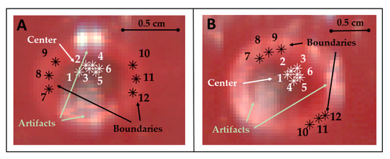 Pixels of the center and boundary of the lesion selected for studying the area under the spectral curves (spectral integrals) in Test 1 (A) and Test 2 (B). Pixels were selected in zones not affected by artifacts. Positions chosen for these pixels are highlighted using RGB images collected by the HS camera at the end of the treatment and showing the thermal damage.