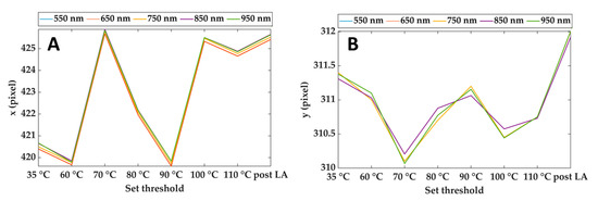 Horizontal (A) and vertical (B) coordinates of the reference point (center of the cropping rectangle) for different wavelengths and during the treatment. Results refer to Test 1.