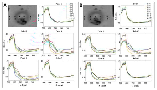The thermally-damaged zone has been explored by analyzing the spectral information in correspondence with the center and boundary of the target. In particular, the study involved the calculation of the areas under the spectral curves for the four wavelength ranges (hereinafter referred as spectral integrals). The analysis has been performed for points belonging to both the center and boundary of the target and for each test (Figure 3).