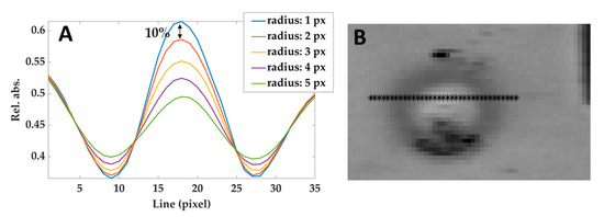 (A) Relative absorbances profiles taken from a line of pixels crossing the lesion (shown in (B)) in the image filtered using different radius. The black arrow shows the difference between the curves obtained by using 1 pixel-filter and 2 pixels-filter and defining the maximum acceptable reduction of 10%. Similar results have been obtained at different temperatures and hypercubes.