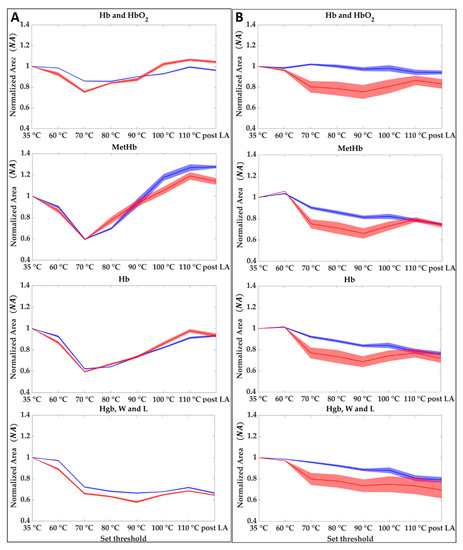 Hb and HbO2, Hb, MetHb, and Hgb, W and L at different set thresholds for central (A) and boundaries pixels (B). Each graph shows the averaged area trends (normalized mean area values and their uncertainty) for Test 1 (blue) and Test 2 (red).