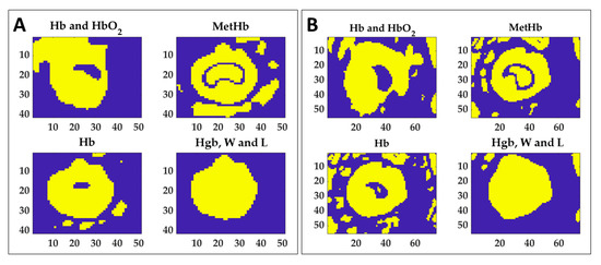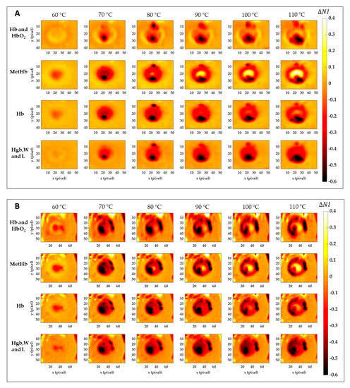 Normalized image variation for the four peculiar spectral ranges corresponding to Hb and HbO2, MetHb, Hb, and Hgb, W and L. Images are obtained with respect to the initial condition for Test 1 (A) and Test 2 (B) for the six temperature thresholds.
