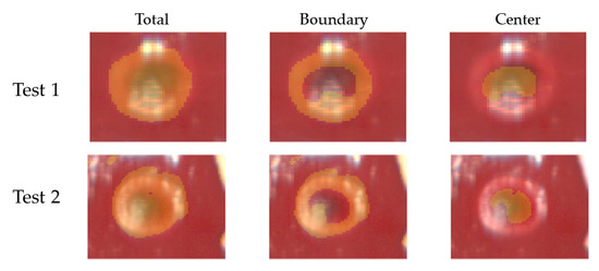 Results of segmentation for Test 1 and Test 2. Masks extracted using the thresholding technique were used to segment total damaged, boundary, and center zones in the RGB images acquired by the hyperspectral camera at the end of the ablation procedure and clearly showing the thermal outcome.