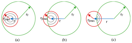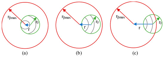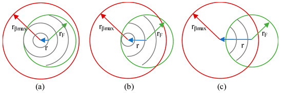 - Case II: rF < rβmax < 2rFAs the radial position increases, the integration limits are first a mix of circumferences and arcs, then a mix of circumferences and arcs with different limits and, finally, only arcs, see Figure 4.