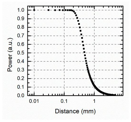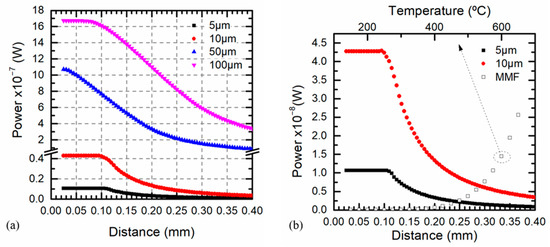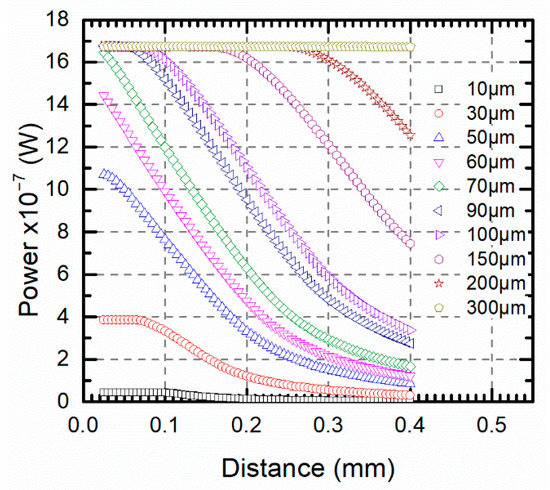 Figure 9a shows the relationship between the pyrometer optical power and the distance for different target sizes ranging from 5 to 100 μm. At a constant temperature according to Equation (14) for target sizes far away from the fiber diameter, tc was clearly identified and larger distances kept the maximum optical power whose value depended on the target size. On the other hand, if the target size was similar to the fiber diameter, it was difficult to find a constant power for any position.