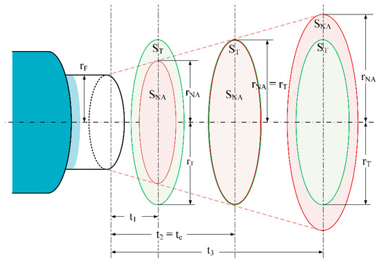 Figure 7 shows the relation between the numerical aperture radius rNA and the target radius rT at different target-fiber distances, t. The numerical aperture surface SNA changed with the target-fiber distance t as follows. From the critical distance, tc, whether t < tc, the target surface ST was larger than the NA surface SNA and, in this case, the output power was constant for a specific temperature. As the measuring distance became larger than tc, the target surface became gradually smaller than the NA surface. In this case, the output power decreased when the measuring distance increased although the temperature was constant.