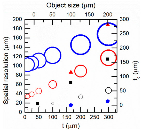 Left y-axis and bottom x-axis: spatial resolution as a function of the target-fiber distance for three different optical fibers (core diameter/NA): black: 9 μm/0.14, red: 62.5μm/0.275, blue: 200 μm/0.2. Right y-axis and top x-axis: tc as a function of the object size for those fibers: black squares: 9 μm/0.14, red triangles: 62.5 μm/0.275, blue pentagons: 200 μm/0.2.