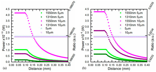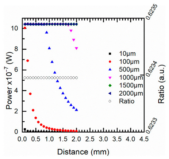 Figure 12 shows the simulations of the optical power at 1310 nm when the target-fiber distance and the target sizes changed from 0 to 4.5 mm and from 10 to 2000 μm, respectively. The behavior of the optical power was similar to the one described for 1550 nm although the energy recovered at this wavelength band was lower. On the other hand, for all target sizes, the power ratio between both channels was independent of the positioning at 1000 °C, see Figure 12.