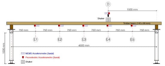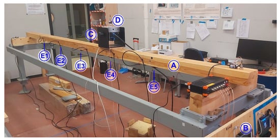 The timber beam is placed on a wooden support which is, in turn, placed on a steel frame. It lies in a horizontal position (140 mm) with a separation between supports of 4500 mm, as can be seen on Figure 6. It is instrumented with 5 pairs of accelerometers evenly distributed on the timber beam (750 mm of separation), at the positions marked as E1 to E5 on Figure 6. Each pair of accelerometers is formed by a piezoelectric accelerometer (KS76C.100) and a MEMS accelerometer (ADXL355). The beam is excited with an electromechanical shaker placed in the vicinity of the fourth pair of accelerometers, at 1500 mm from the right support, oriented in the vertical direction as can be observed in Figure 6. Additionally, another pair of accelerometers is placed on the moving mass of the shaker (0.23 kg), labeled as D, to record the input force (calculated as the measured acceleration times the value of the moving mass), as it is shown in Figure 6. The laboratory measurement layout can be observed in Figure 7. In this figure, the timber beam is marked with the letter A, the myRIO device is marked with the letter B, and the shaker is marked with the letter C.