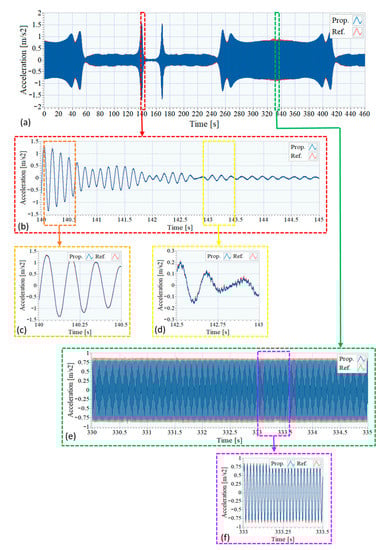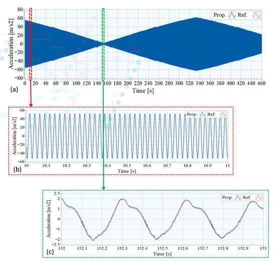 Figure 8 shows the excitation signals registered with both systems by using the accelerometers placed on the moving mass of the shaker, in position D. Given that the shaker is excited with a constant amplitude sinusoidal sweep, the amplitude of the measured acceleration is approximately proportional to the signal frequency as can be seen in Figure 8a, which contains both captured signals: in blue, the one corresponding to the proposed system and, in red, the signal associated to the reference system. Due the similarity of these signals, two zoomed plots are shown in Figure 8b,c to emphasize their differences. As can be observed, as the input frequency decreases, and the amplitude of the signal decreases, the signals subtle differences arise mainly due to the higher noise density of the MEMS accelerometers belonging to the proposed system.