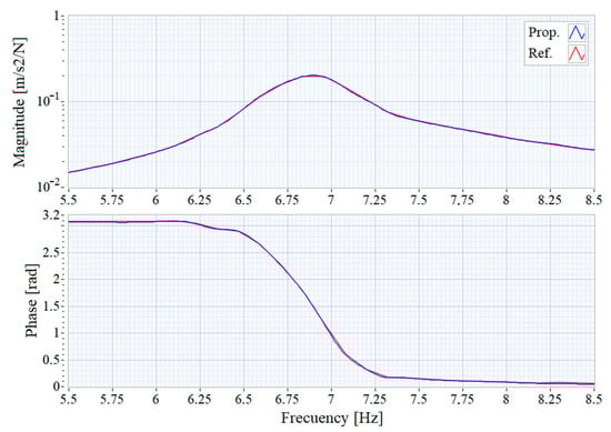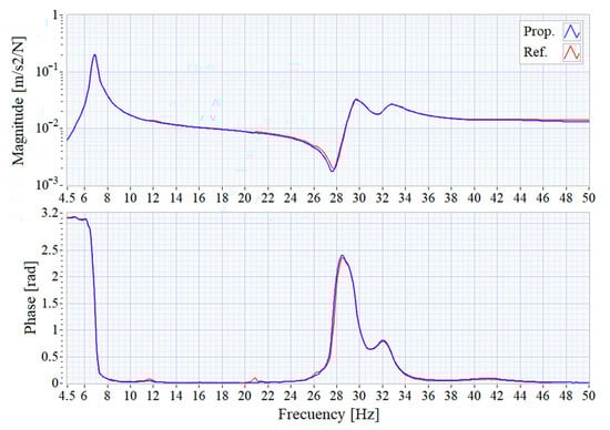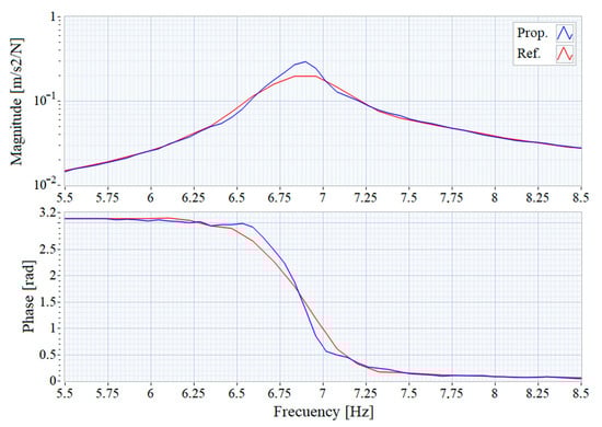 As can be seen, the small discrepancies observed in the time domain recordings result in minimal changes in the frequency domain responses, validating of the proposed system for modal analysis of structures. In both FRFs, a main resonance peak around 6.9 Hz can be clearly distinguished which is shown in detail in Figure 11. The FRF graphs are centered around that peak and show that the results obtained with the two systems are almost identical.