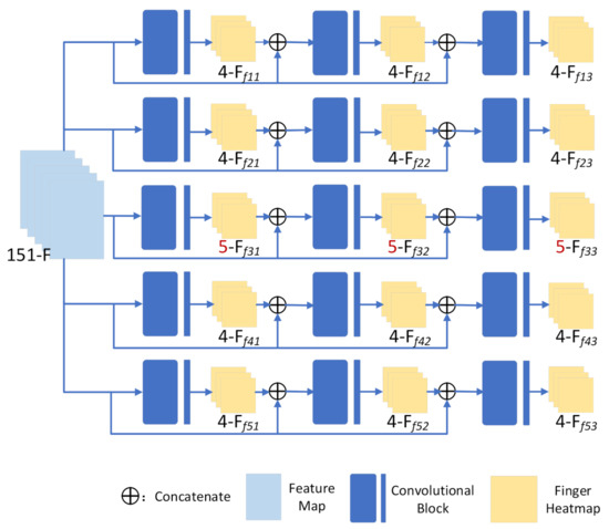 The hierarchical estimation network decomposes hand features into five layers according to five different fingers to estimate the 2D heatmaps of each corresponding finger. As illustrated in Figure 3, there are five layers in the whole network, and each layer is composed of three sub-networks. Taking the first layer (thumb layer) as an example, the 4-channel thumb heatmaps output by the previous sub-network are connected with 151-channel features to form 155-channel features as the input of the next sub-network, which optimizes the location of thumb keypoints iteratively. Then, we take 4-channel 2D thumb heatmaps estimated by the final sub-network as the output for the thumb layer. The 2D heatmap estimation process of other fingers is the same as that of the thumb layer, the only difference being that the number of output channels of middle finger is 5, while others are 4.