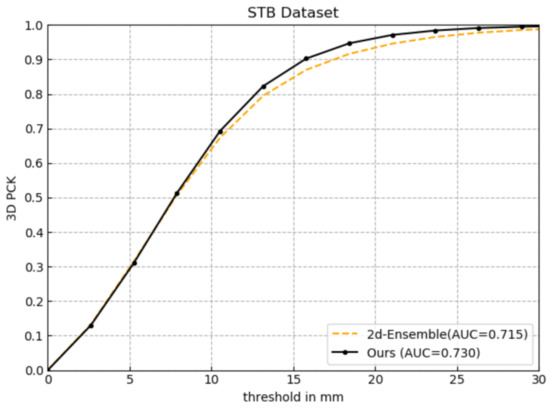 In this section, the effectiveness of another component of our proposed method will be demonstrated: the newly added 3D finger pose constraints. The basic network architecture is kept the same, among which Ours adds five 3D finger pose constraints, while 2d-Ensemble directly fuses the 2D finger feature information to estimate full 3D hand pose. Ours and 2d-Ensemble are evaluated on STB with the metrics in Section 4.1.4; the experimental results are shown in Figure 5 and Table 2.