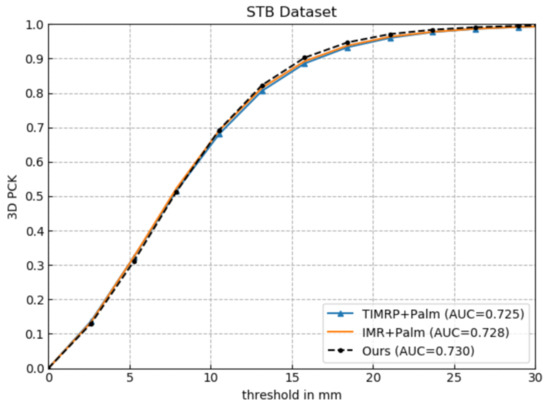 To verify the superiority of our five-layer network, in this experiment, we uniformly use a hand model with the Palm connected to the middle finger and add 3D finger constraints. Only the hand hierarchical structure is changed, which is divided into five layers, four layers, and three layers, represented by Ours, 4L-M+Palm, and 3L-M+Palm, respectively. The hand division structure of the four-layer and three-layer layers is T, I, M, R/P, and T/I, M, R/P. The experimental results of using the evaluation metrics in Section 4.1.4 to evaluate Ours, 4L-M+Palm, and 3L-M+Palm on the STB dataset are shown in Figure 4 and Table 1.