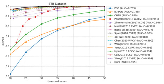 Figure 9 shows the comparisons with state-of-the-art methods [8,12,13,14,15,19,25,36,37,38,39,40,41,42] on the STB dataset; Ours represents the proposed 5LENet. It is worth noting that in addition to the pose estimation error, the process of hand positioning will also produce the error, so the methods involved in the comparison also need to add the corresponding localization error if they do not have it. As presented in Figure 9, our method achieves the highest AUC value 0.995 within the error threshold of 20-50mm; compared with 0.948 of Zimmermann et al. [12] and 0.988 of 4CHNet [25], the performance improves by 0.047 and 0.007, respectively, where 4CHNet [25] employs a hierarchical network to divide hand features into two layers of palm and finger features. The high precision estimation result of ours again verifies the effectiveness and advancement of the five-layer network and five newly added 3D finger constraints. There is a substantial improvement compared with the 0.991 of Wang et al. [13] and Yang et al. [39], while Wang et al. [13] use an RHD-trained localization segmentation network to crop the hand area, which cannot adapt well to the real environment compared with the OneHand10K-trained network. Yang et al. [39] achieve image synthesis and pose estimation by learning disentangled representations of hand poses and hand images, but to a certain extent, the disentangling process will lead to the missing information that helps to generate useful data. Additionally, although the estimation results of Iqbal [42], Xiang [41], and Cai et al. [15] are significantly close to ours, it is necessary to emphasize the difference between theirs and ours here. Among them, in [41,42], the hand location error is not considered, and in [15], the paired depth and RGB image are required, which are rather difficult to collect, so our network is superior to theirs to a certain extent. The results from competing methods are derived from the corresponding literature.