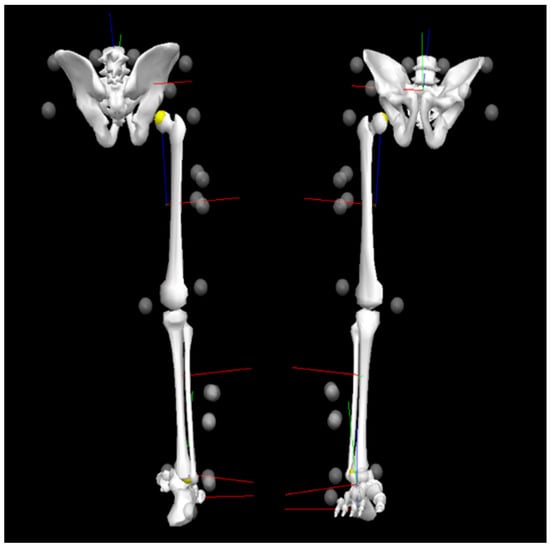 Attachment of markers on lower extremity (the axis of angular displacement and velocity were defined as Figure 2, red line = positive x-axis vector, green line = positive y-axis vector, blue line = positive z-axis vector, white circle = attachment of marker).