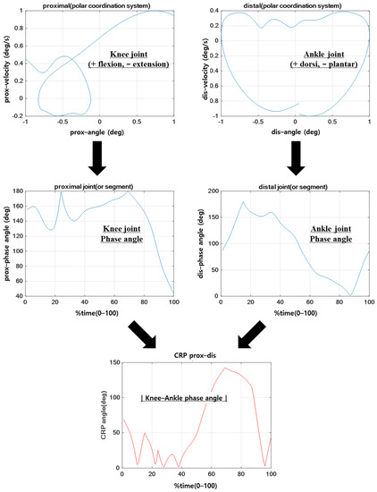 The normalized angular displacement and angular velocity were converted from the cartesian coordinate system to the polar coordinate system, and the phase angle of each joint within the polar coordinates was calculated to be within 0–180° using Formula (3) with respect to the right horizontal axis. The calculated phase angle of each joint was expressed as CRP based on the difference between the two values, as shown in Formula (4) [39].