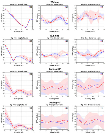The difference between the two groups in the knee–hip CRP during walking (Table 2) was nonsignificant. During running, the hip–knee CRP was significantly different between the groups in the sagittal plane, while the knee–ankle CRP was significantly different between the groups in the transverse plane (Table 2; p < 0.05). Furthermore, during cutting at 30°, the hip–knee CRP was significantly different between the groups in the sagittal plane (Table 2; p < 0.05). During cutting at 60°, the hip–knee CRP was significantly different between the groups in the sagittal plane (Table 2; p < 0.05), and the knee–ankle CRP revealed a significant difference between the groups in the frontal plane (Table 2; p < 0.05) (Figure 4 and Figure 5).