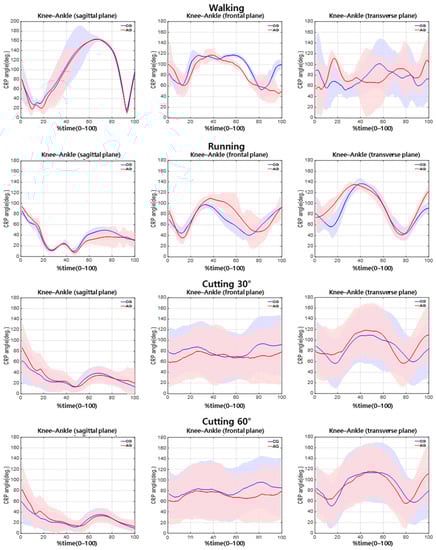 The CRP variability in the hip–knee joint was not significantly different between the groups during walking, running, or 30° cutting. However, a significant difference in the CRP variability in the hip–knee joint couple between the groups during 60° cutting in the sagittal plane was noted (Table 3; p < 0.05). However, the CRP variability in the knee–ankle joint was not significantly different between the groups (Figure 4 and Figure 5).
