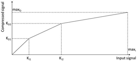 Unfortunately, the HDR image sensor produces much more data than the standard dynamic range (SDR) sensor. A simple piecewise linear (PWL) compression (a logarithmic type compression) is typically used to compress the bit-length of image data (Figure 1). Input signals from the image sensors, with values up to the first knee point () are not changed. Signal values greater than , but lower than are compressed by reduction of the number of bits that represent an excess value (between and . After each knee point further bit reduction for next excess values arises. The higher the value, the more compressed it is. In consequence, high values of the signal (very bright pixels) are represented with lower accuracy, but the image sensor produces HDR images with a relatively low bits per pixel number.