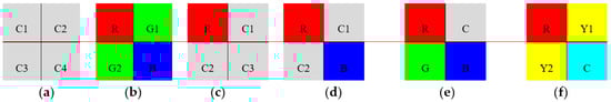 Six optical color filter arrays that may be found in ADAS and ADS solutions are presented in Figure 2 as 2 × 2 periodic patterns that constitute the whole imaging sensor.
