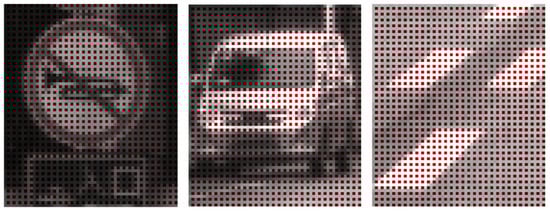 The above disadvantages are very undesirable in ADAS and ADS applications. Therefore, instead of the Bayer color filter, the RCCC color filter is commonly used. The RCCC consists of red, clear, clear, clear sensors (clear means colorless, i.e., fully transparent or more precisely panchromatic filter, i.e., transmitting all visible spectral colors), see Figure 2c. Unlike the RGGB Bayer sensor, the RCCC sensor uses only the red color optical filter, and for each four horizontally/vertically neighboring pixels in the mosaic three of them have clear filters. Hence, the image generated by the RCCC sensor is almost as detailed and bright as the monochrome sensor but still provides the red color component information []. This improves ability of automatic detection of traffic lights, rear lights of vehicles, important informative parts of road signs, etc.