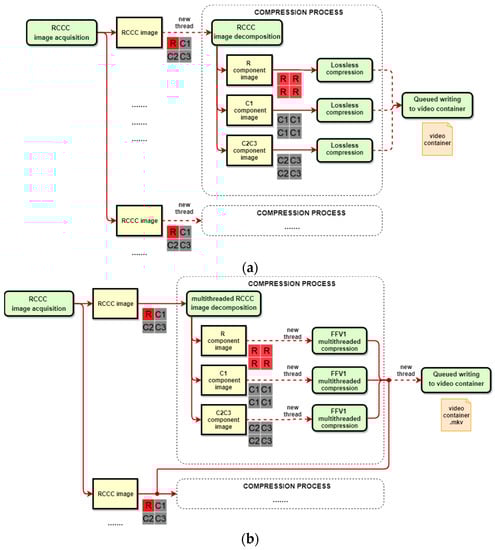 To speed-up the processing, the compression process is parallelized by starting new compression thread with a new RCCC image (or more precisely with three new images, i.e., R, C1, C2C3). Only the writing procedure to the common video container needs to be queued. A scheme of the whole proposed procedure is presented in Figure 7a. It is assumed that the FFV1 codec works in the standard mode.