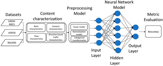 This paper introduces the background and related work to this research work during Section 2. Additionally, the paper introduces the proposal of a new way of data preprocessing based on traffic characterization for IDSs in Section 2. Furthermore, in Section 3, Section 4, Section 5 and Section 6, we explain the problem statement and the proposed methodology, defining the methodology ML and preprocessing model presented in this paper. These sections also include the architecture proposed for applying the multilayer perceptron (MLP) and the obtained results after applying our proposal to the UNSW-NB15, UGR16, and KDD99 datasets. Finally, Section 5 includes the discussion of the main conclusions and future lines for this research.