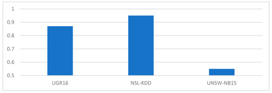 The results obtained from the training and validation of the proposed algorithm show that the NSL-KDD dataset offers a better accuracy, with 95.5%, compared to 87.68% of the UGR16 and 55.80% of the UNSW-NB15. These values are represented in Figure 3. It should be noted that the architecture of the neural network is the same for all datasets as described in Section 3.3.