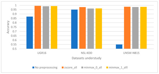 Finally, the UNSW-NB15 dataset was evaluated with the same configuration mentioned above, that is, z_score_all, minmax_0_all, and minmax_1_all, and producing values of 98.3%, 98%, and 98.2% in terms of accuracy respectively. All of these results are summarized in Figure 4.