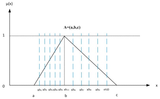 A fuzzy set is a collection of elements in a universe of information where the boundary of the set contained in the universe is ambiguous, vague, and otherwise fuzzy [32]. In this study, we consider fuzzy numbers as positive triangular fuzzy numbers, which are characterized by a membership function shown in Equation (1) and Figure 1 [33]. The arithmetic operations between two fuzzy numbers, such as , and , are demonstrated as shown in Equations (2)–(6) [18].