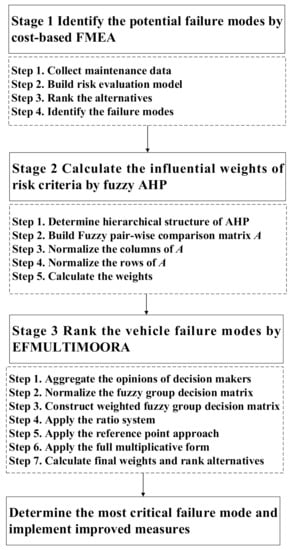 In this section, a hybrid approach based on cost-based FMEA, FAHP, and EFMULTIMOORA is presented to address the problem of risk evaluation for vehicle failure modes with interconnections and feedback between certain risk factors. The proposed hybrid approach for evaluating the risk of vehicle failure modes consists of three main stages: (1) identify the potential failure modes using cost-based FMEA; (2) calculate the influential weights of risk criteria using FAHP; (3) rank the vehicle failure modes using EFMULTIMOORA. The flowchart of the proposed hybrid method can be seen in Figure 2.