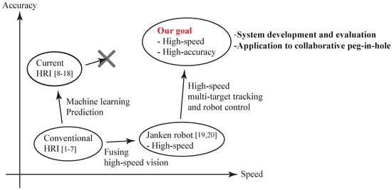 Thus, this research pursues the goal of a high-speed, high-accuracy HRI system, and the target area is the top-right area shown in Figure 1. To achieve this, we developed a high-speed, high-accuracy HRI system using high-speed vision (1000 fps image acquisition), high-speed image processing (1000 fps image processing) and high-speed robot control (real-time visual feedback). At present, the main approach that has been used to develop HRI systems is to improve the accuracy first by using machine learning and prediction, and then also improve the speed by speeding up these processing steps. With this approach, the authors consider that it is extremely difficult to speed up the processing. As a result, speed improvement cannot be achieved successfully. On the other hand, our approach is that the speed will be improved first by fusing high-speed vision and a high-speed robot, and then the accuracy will be also improved by using high-speed multi-target tracking and robot hand control. Based on this approach, we can achieve a high-speed (real-time performance) and high-accuracy HRI system. Such an approach can be considered to be a novel feature of this research.