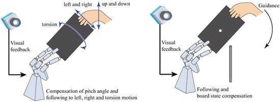 - Robot Control part in Figure 7: The robot hand was controlled according to the position and orientation of the board (Section 3.3).