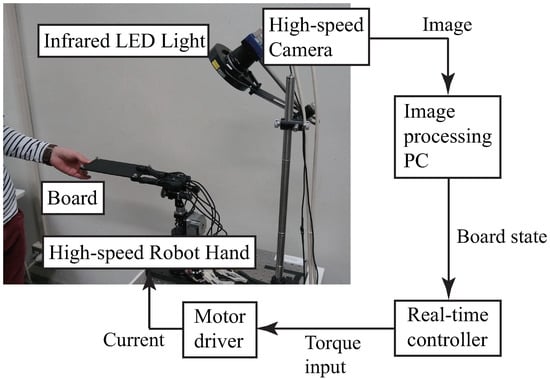 - A real-time controller that receives the state values of the board (position and orientation) from the image-processing PC at 1 kHz and also controls the high-speed robot hand at 1 kHz,
