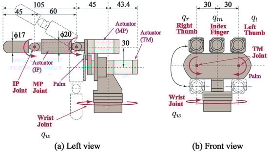 As the actuation system of the collaborative system, we used a high-speed robot hand, as shown in Figure 4 [25]. The joint of the robot hand has a closing speed of 180° in 0.1 s, which is a level of performance beyond that of a human hand.