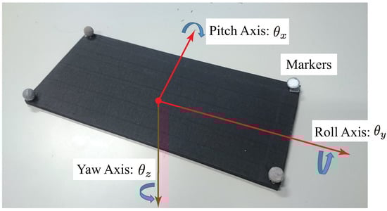 From the transformation matrices and , the transformation matrix from the board coordinates to the global coordinates was obtained. Consequently, the rotation matrix and the translation vector could be obtained; that is, the board position and orientation in global coordinates were measured.