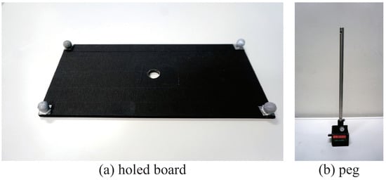 The board had a length of 220 mm, a width of 100 mm, a thickness of 5 mm and a mass of about 113 g. Retro-reflective markers were attached at four corners of the board to simplify corner detection by the high-speed camera. The configuration of coordinate axes on the board was as shown in Figure 5. In addition, the hole used in the collaborative peg-in-hole task was formed at the center of the board, as shown in Figure 6a. The radius (R) of the hole was 6.350 mm.