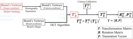 In Figure 8, the red elements are important for measuring the position and orientation of the board. Thus, we describe methods to calculate the transformation matrix (Section 3.2.1), to track the markers attached to the corners of the board visually (Section 3.2.2) and to convert the roll, pitch and yaw angles from the transformation matrix (Section 3.2.3). Figure 9 shows the relationship between transformation matrices.
