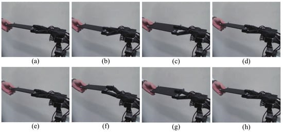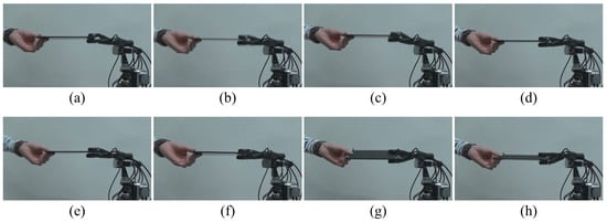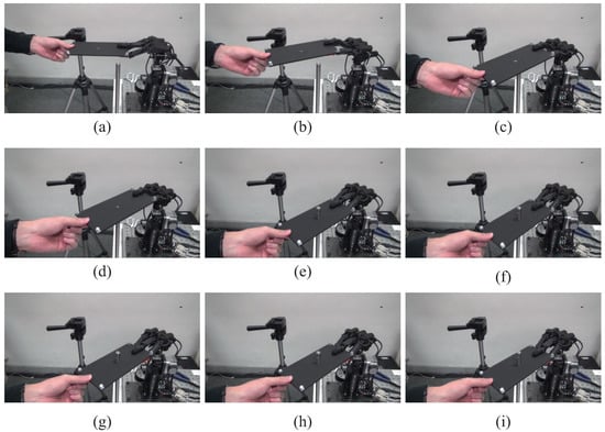 Figure 18 and Figure 19 show the experimental results and data of the collaborative peg-in-hole task. Furthermore, a video of the experimental result is available on our website [32,33]. Figure 18a is the initial state. Figure 18a–d shows the collaborative motion, and Figure 18e–i shows the collaborative peg-in-hole task. From the experimental results, the collaborative peg-in-hole task was carried out successfully. In particular, a human could move the board upward and downward smoothly, even when the peg was inserted in the hole. In general, it was not possible to move the board smoothly when the peg was in the hole.