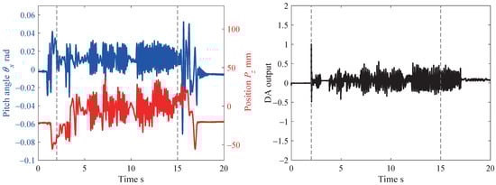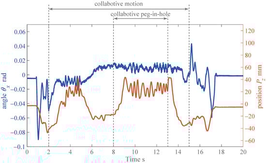 In Figure 19, the collaborative motion was performed in the period of 2–15 s, and the collaborative peg-in-hole task was also performed in the period of 8–13 s. From Figure 19, it can be seen that the board could be moved upward and downward without the lock phenomenon using our proposed method and developed system, even when the peg-in-hole task was achieved. In fact, even when the z-location of the board was varied upward and downward, the pitch angle was settled at around 0.1 rad. In addition, since the pitch angle was not varied instantly comparing with the z-location, we found that the insertion and removal actions could be achieved smoothly.