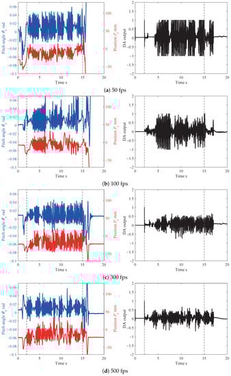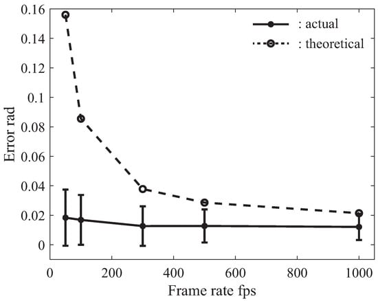From the results described in Section 4.2, it can be seen that the collaborative error mainly depended on the frame rate. Therefore, we performed experiments with various frame rates: 50, 100, 300, 500 and 1000 fps. Figure 14 shows the theoretical and actual collaborative errors (pitch angle ), and Figure 15 shows the collaborative errors (left figures) and DA output (right figures) with various frame rates.